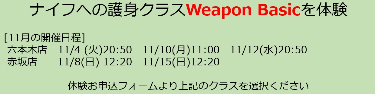 まずは対ナイフの護身の基礎が学べる「Weapon Basic」クラスを体験してみてください。。一度クラスに体験参加されれば、正しい技術を教わることの重要さや、武器対策の基本が何かをご理解いただけると思います。